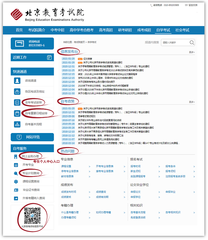 点击北京教育考试院官网(www.bjeea.cn)的“自学考试”,可进入自考栏目。栏目包括「信息发布台」、「自考政策」、「热点问题」等核心版块,全年考试安排、全年日程安排等重要信息,以及考生个人中心、专业计划查询等系统的入口。