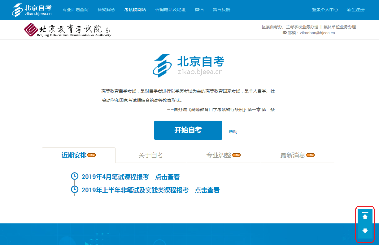北京自考首页(zikao.bjeea.cn)是2015年上线的北京自考门户网站,点击页面右下角的按钮,可逐个查看「北京自考指南」、「了解专业与课程」、「了解考试安排」、「购买教材进行学习」、「参加自考,做更好的自己」等多个帧页内容,内容不多,建议新生认真阅读,可以对北京自考有一个初步的认识。