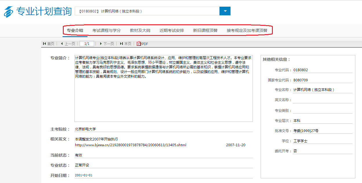 专业计划查询(zkxcx.bjeea.cn)为考生提供北京自考全部专业的计划查询服务,大部分与自考学习内容相关的信息,都能在这里找到。比如,一个专业要学哪些课程(也就是专业考试计划),看「考试课程与学分」;一门课程要考什么内容,见「教材及大纲」;每门课什么时间考,见「近期考试安排」;原来考的老课,现在计划列表里没有了,成绩还能不能用,查「新旧课程顶替」。