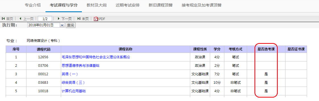 专业计划查询最常用的功能是「考试课程与学分」,专业当前执行期的课程全部列在里面,考生可参考该列表安排自己的学习和考试。大部分专业既有必考课,也有选考课。顾名思义,必考课是该专业规定必须通过考核的课程。而对于选考课程,页面下方另有一个“选考课程关系”的表格,以说明选考门数及选考学分的要求。