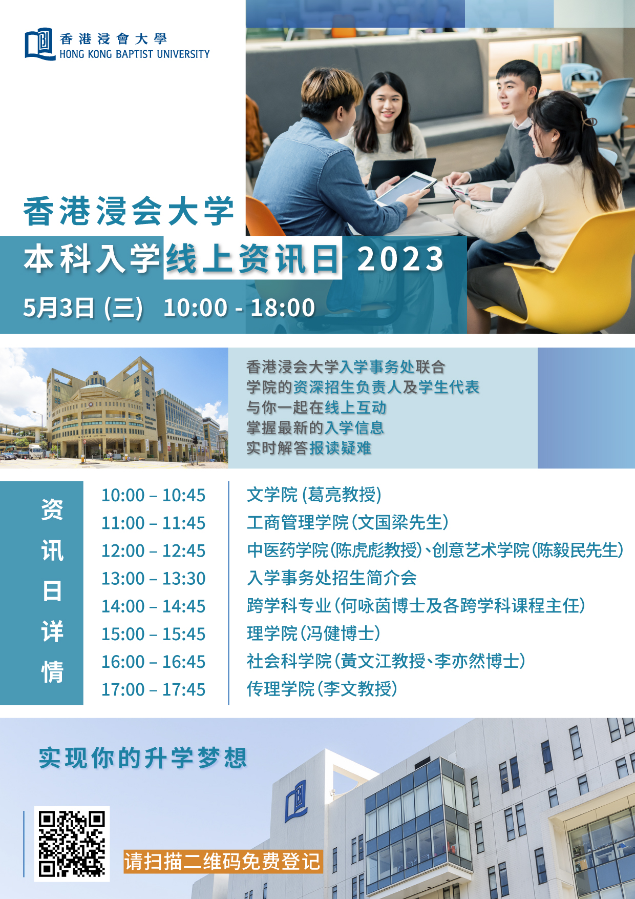 为让有意来港升学的高考生了解香港浸会大学在内地的招生政策,我校现定于5月3日(星期三) 举行线上资讯日,详情如下: