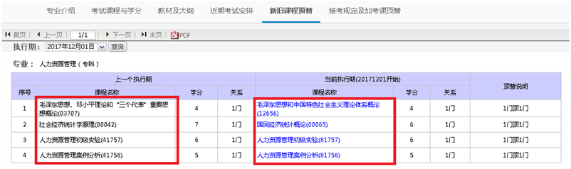 举例:下图是人力资源管理(专科)旧计划的课程顶替关系,左侧中“上一执行期”课程以及右侧中“当前执行期”课程均可以顶替新计划中的相应课程。考生可于今年10月31日以后在专业计划查询系统中人力资源管理(专科)新计划的顶替关系中查看。
