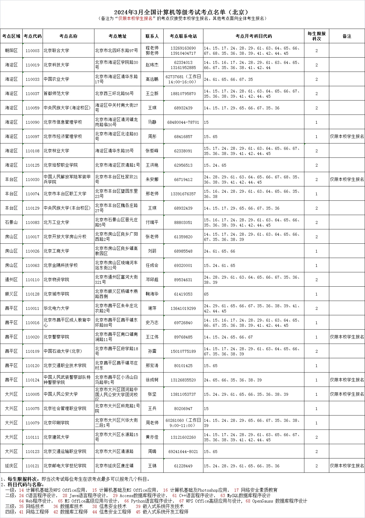 2024年3月NCRE考点名单(北京)