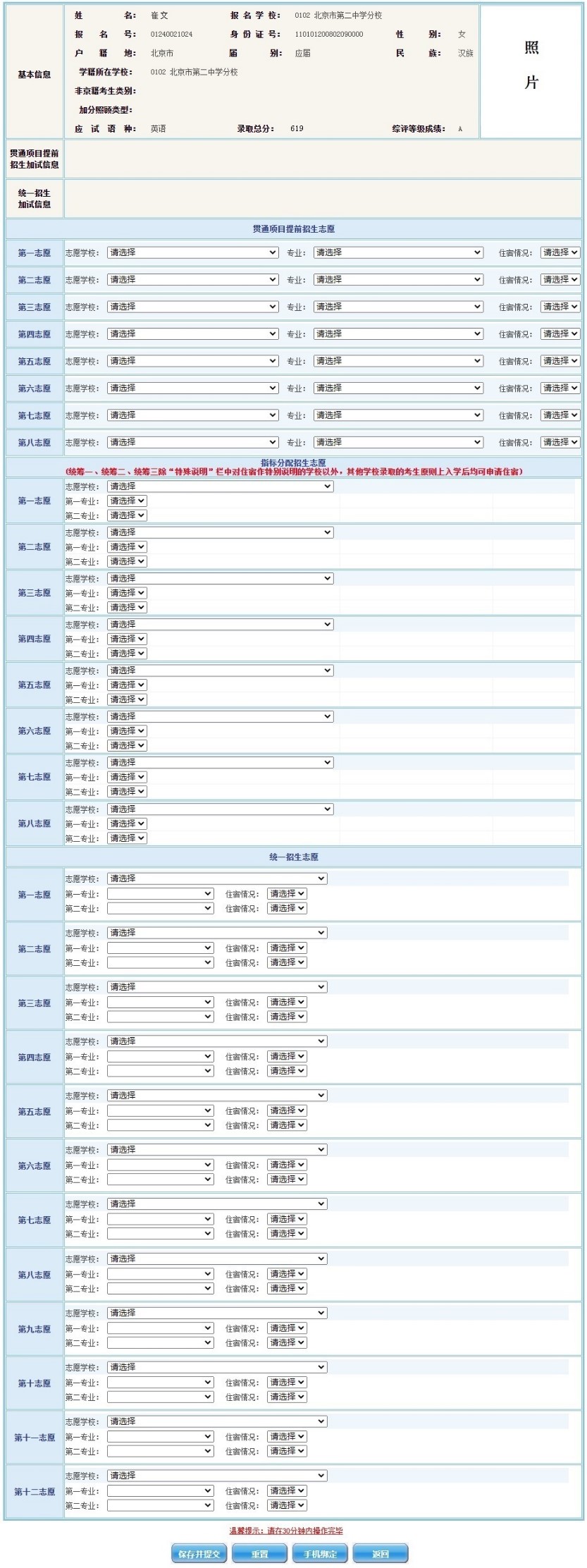 (六)考生所填报的内容是2024年北京市高级中等学校招生录取的重要依据,考生要熟悉了解中招有关政策、实施方法、学校招生要求、上课地点、收费标准等,并按要求认真填报,因填报错误造成后果由考生本人负责。