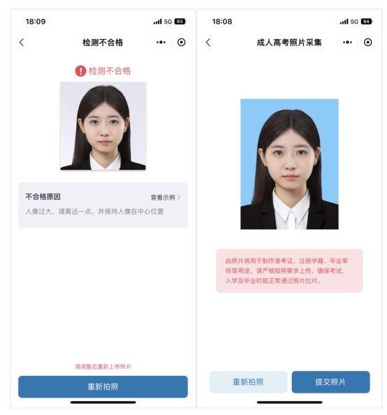 2)调整与重拍:若照片不合格,根据页面提示的不合格原因进行调整,并点击“重新拍照”重新采集照片,直至照片合格。