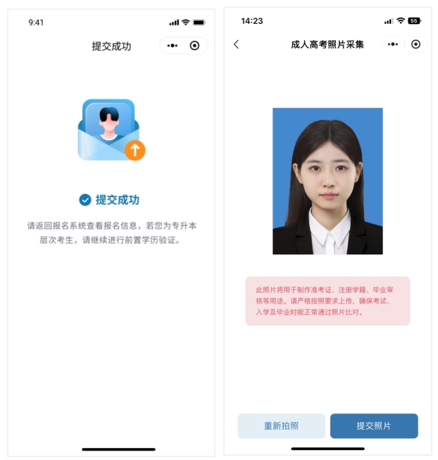 3)确认提交:照片合格后,对照片满意请点击“提交照片”按钮完成提交。若不满意,可继续点击“重新拍照”按钮进行调整,以确保您获得最满意的照片。