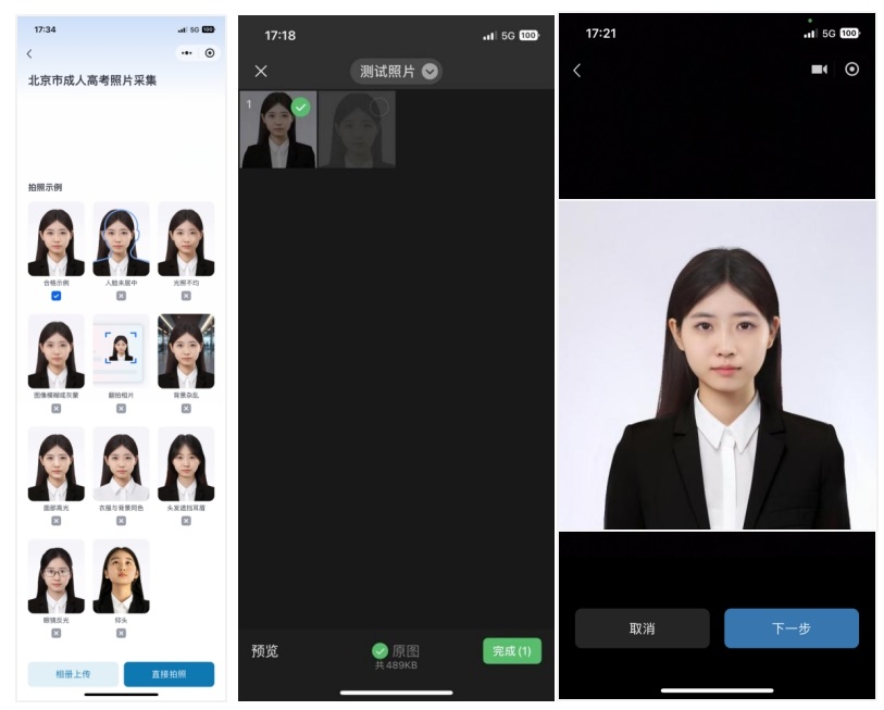 “直接拍照”:请他人协助并使用后置摄像头拍摄,拍摄满意后点击“下一步”,不满意则点击“取消”重拍。